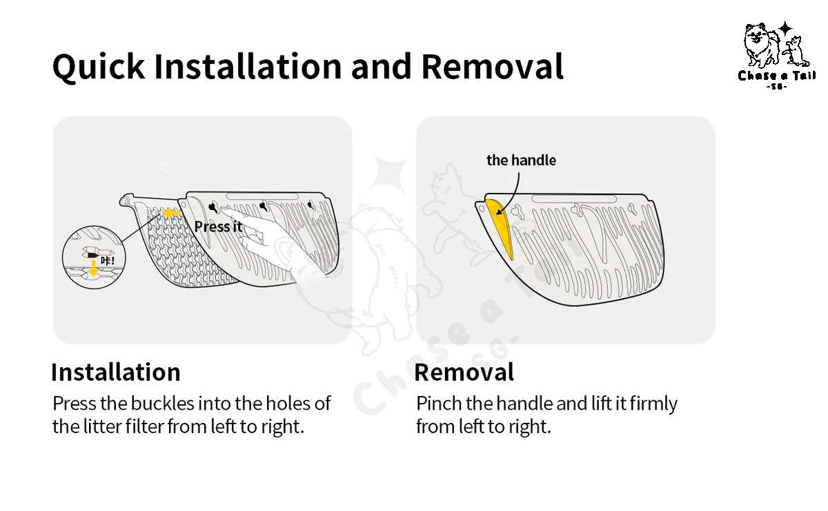 • Quick Installation & Removal: The removable design allows for quick installation and removal. Just press the buckles into the litter filter holes, and you’re ready to go. When it’s time to clean or replace, simply pinch the handle and lift.
