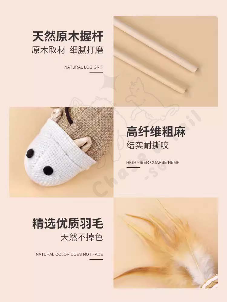 Crafted from high-fiber coarse hemp and topped with selected premium feathers, this toy is not just durable but also gentle on your cat’s teeth and claws. The natural log grip ensures a comfortable hold for you, while the long, flexible string allows you to dangle, swipe, and tease with ease, encouraging your cat to jump, pounce, and chase.