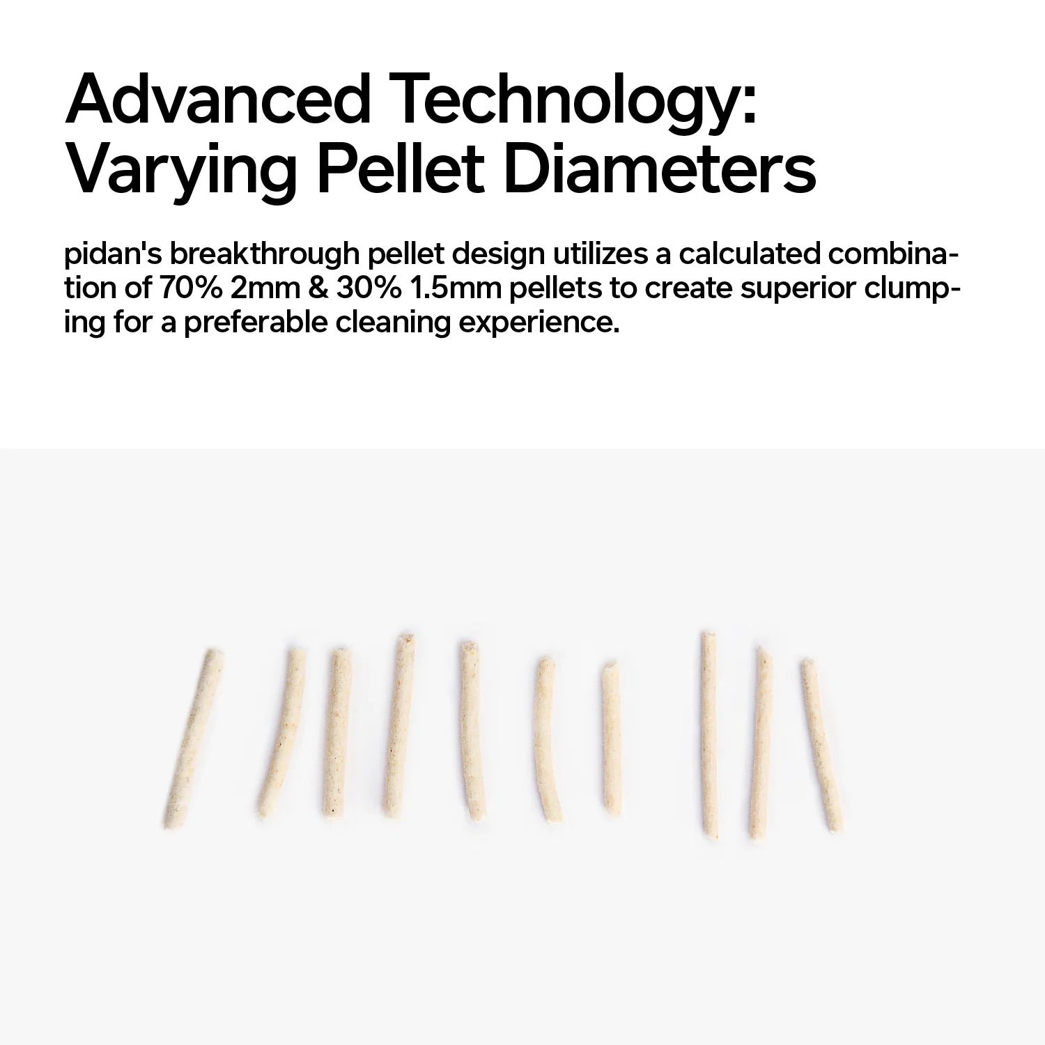 Pidan's breakthrough pellet design utilizes a calculated combination of 70% 2mm & 30% 1.5mm pellets to create superior clumping for a preferable cleaning experience.